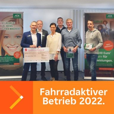 Seit vielen Jahren beteiligt sich ANF bei der Aktion „Mit dem Rad zur Arbeit“. Die AOK ruft mit dieser Aktion bundesweit dazu auf, Kilometer auf dem Fahrrad „zu sammeln“. Das ist gut für die Fitness der Beschäftigten und für die Umwelt. Im November wurde ANF Lingen sogar als „Fahrradaktiver Betrieb 2022“ ausgezeichnet. Der Betrag von 1000 Euro wird natürlich in die Förderung des Radfahrens bei ANF investiert!
