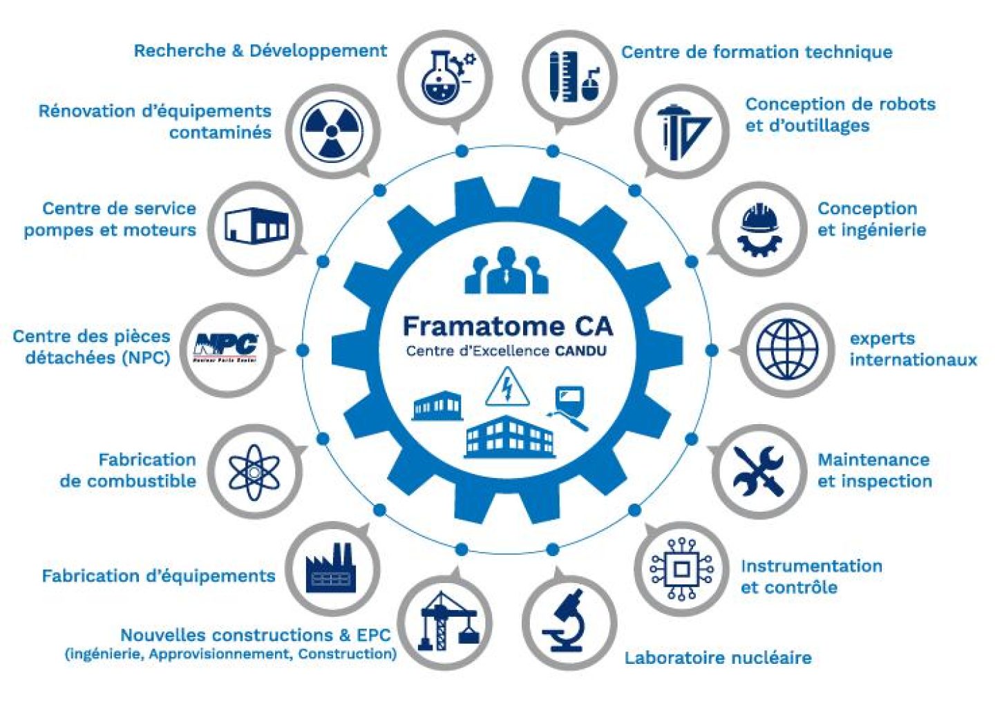 Infographie présentant les différents domaines d’expertise de Framatome au Canada et de son Centre d’excellence CANDU. 14 domaines d’expertise sont répertoriés ici : Rénovation d’équipements contaminés, Conception et ingénierie, Fabrication de combustible, Laboratoire nucléaire, experts internationaux, Instrumentation et contrôle, Maintenance et inspection, Fabrication d’équipements, Nouvelles constructions & EPC (ingénierie, Approvisionnement, Construction), Centre des pièces détachées (NPC), Centre de service pompes et moteurs, Recherche & Développement, Conception de robots et d’outillages, Centre de formation technique.