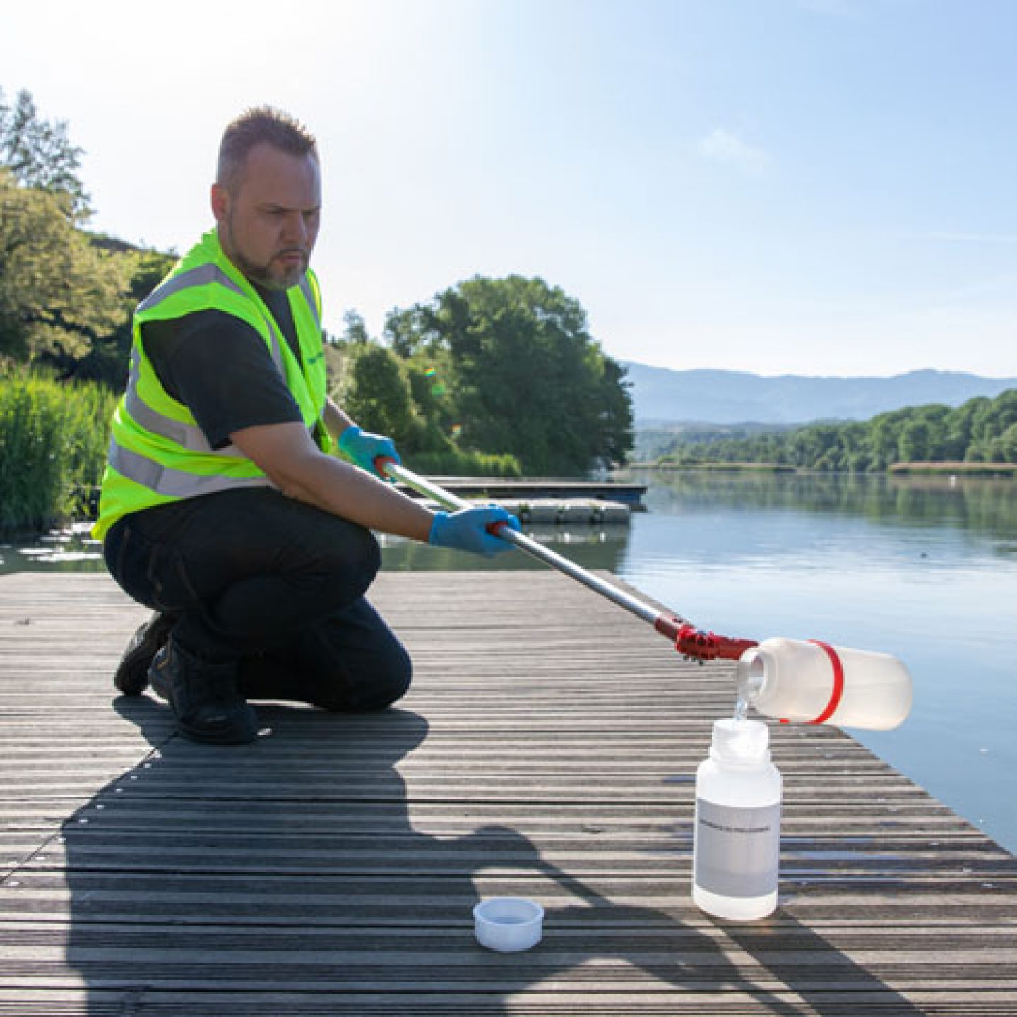 Opération de prélèvement dans la rivière Isère pour mesurer la radioactivité de l'environnement © AD Photographe