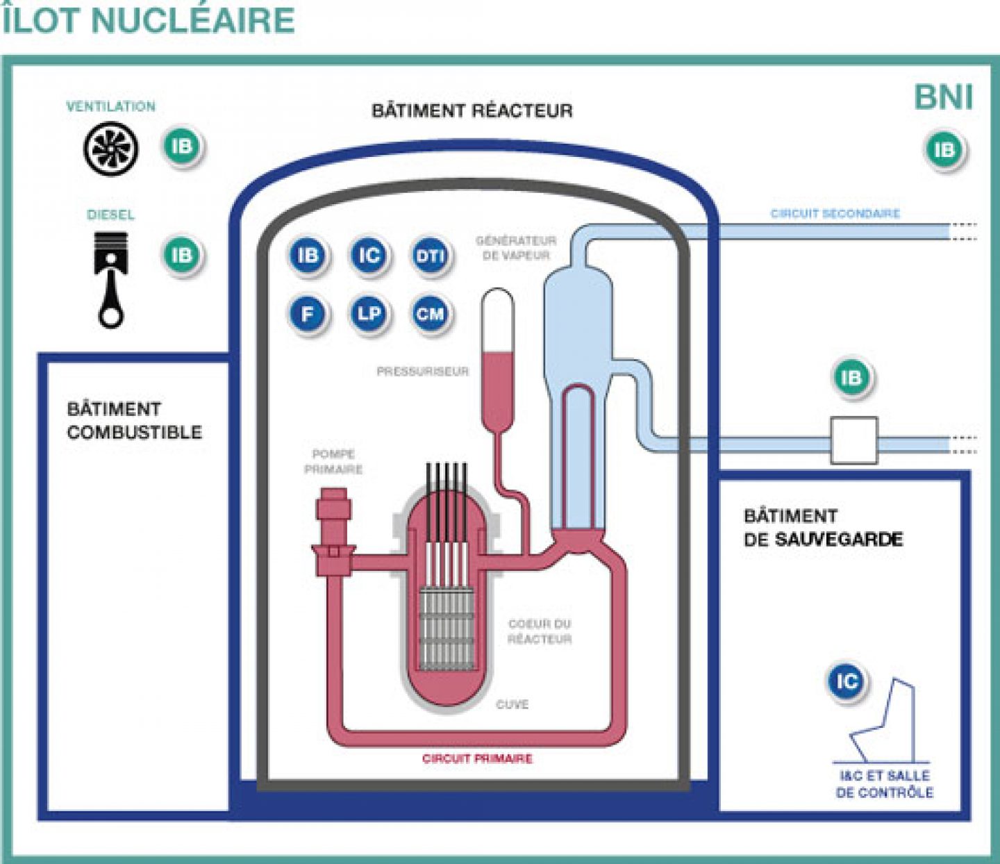 Schéma de l’îlot nucléaire. Les pastilles DTI (direction technique et Ingénierie), CM (Composants), LP (Projets), IC (Instrumentation et contrôle-commande), F (Combustible) ou IB (Base installée) correspondent aux noms des entités impliquées dans la construction de l’îlot.