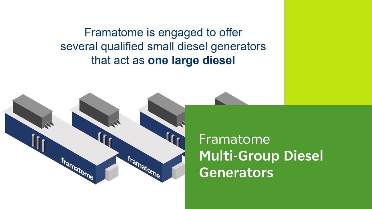La solution Framatome d’un ensembles de petits diesel générateurs permet de remplacer un gros groupe diesel. Plusieurs ensembles au sein de logiques de sûreté type N+1 ou N+2 permet d’améliorer la fiabilité tout en facilitant l’entretien par rapport à un gros diesel unique. Le remplacement d’un gros diesel par plusieurs petits ensembles est également plus aisé que par un autre gros diesel unique. Les ensembles diesel multi-groupes permettent des concepts novateurs tels que atténuation du son, solutions pour conteneurs et mobilité).